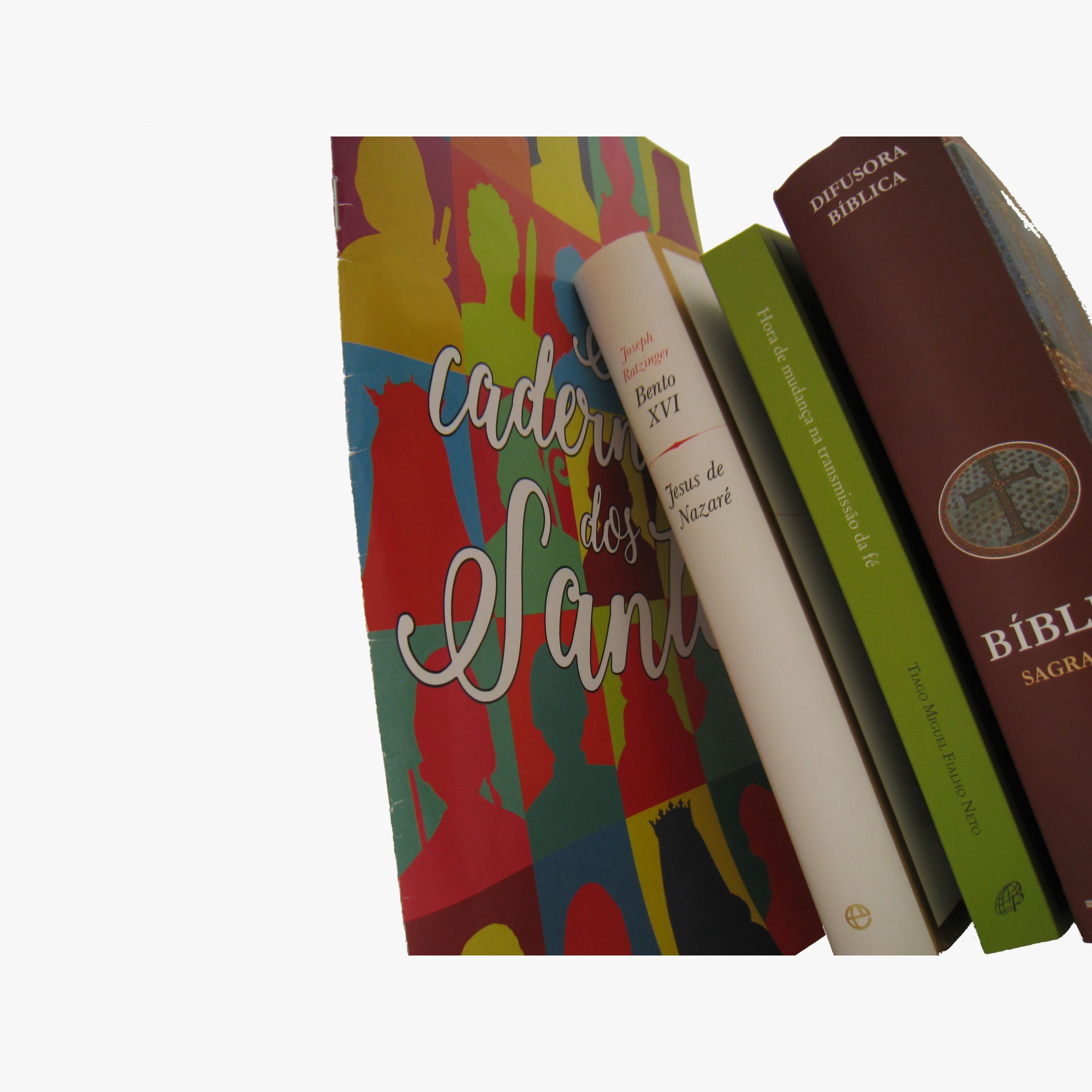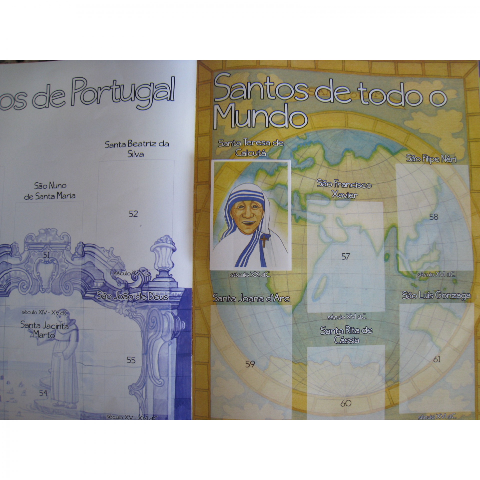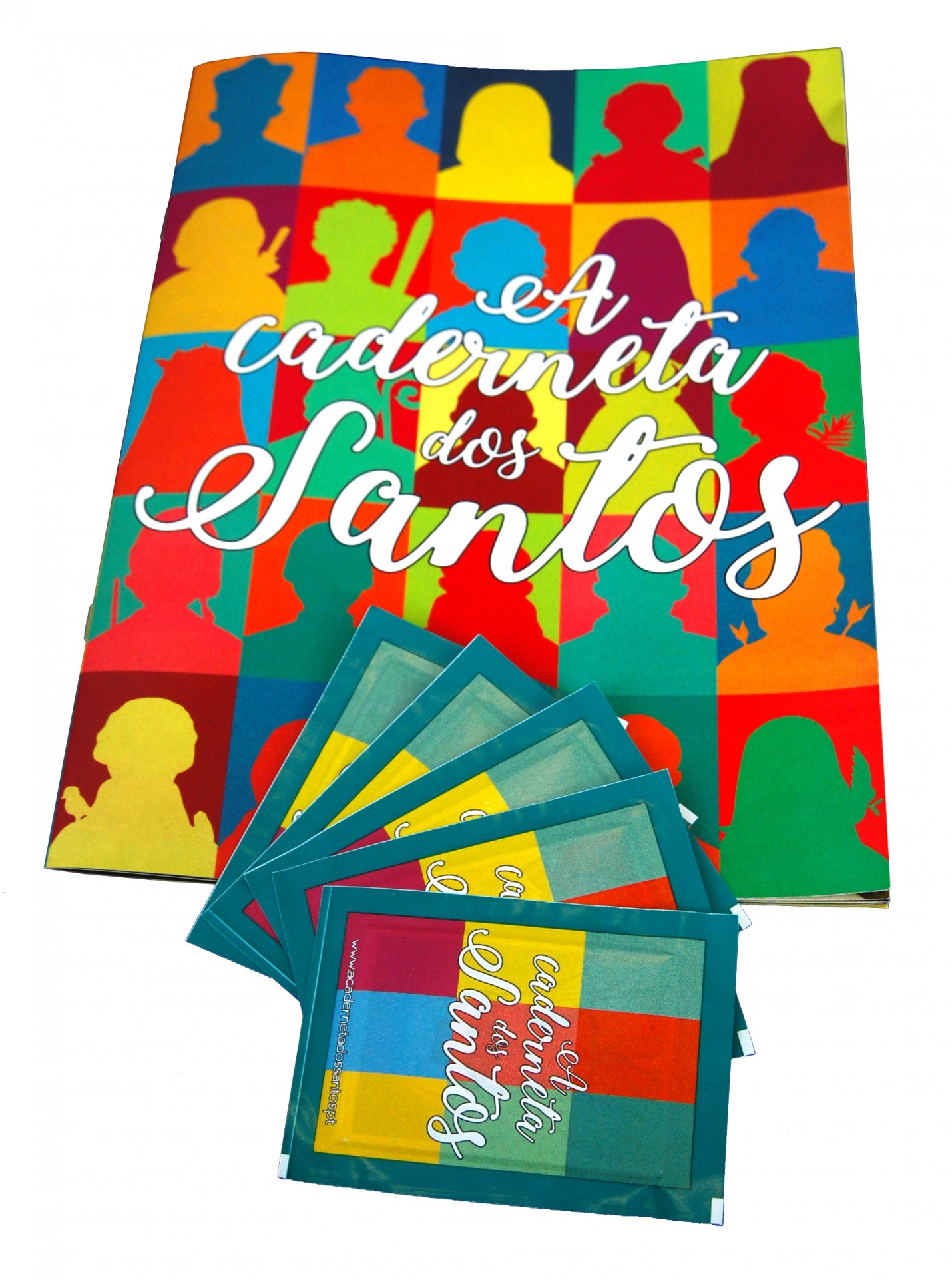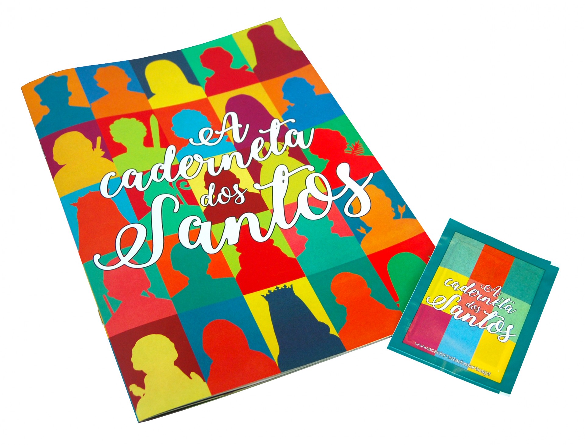 A caderneta dos Santos coleciona 80 imagens e está organizada tematicamente, com ilustrações. E nas últimas páginas uma pequena nota biográfica sobre cada Santo